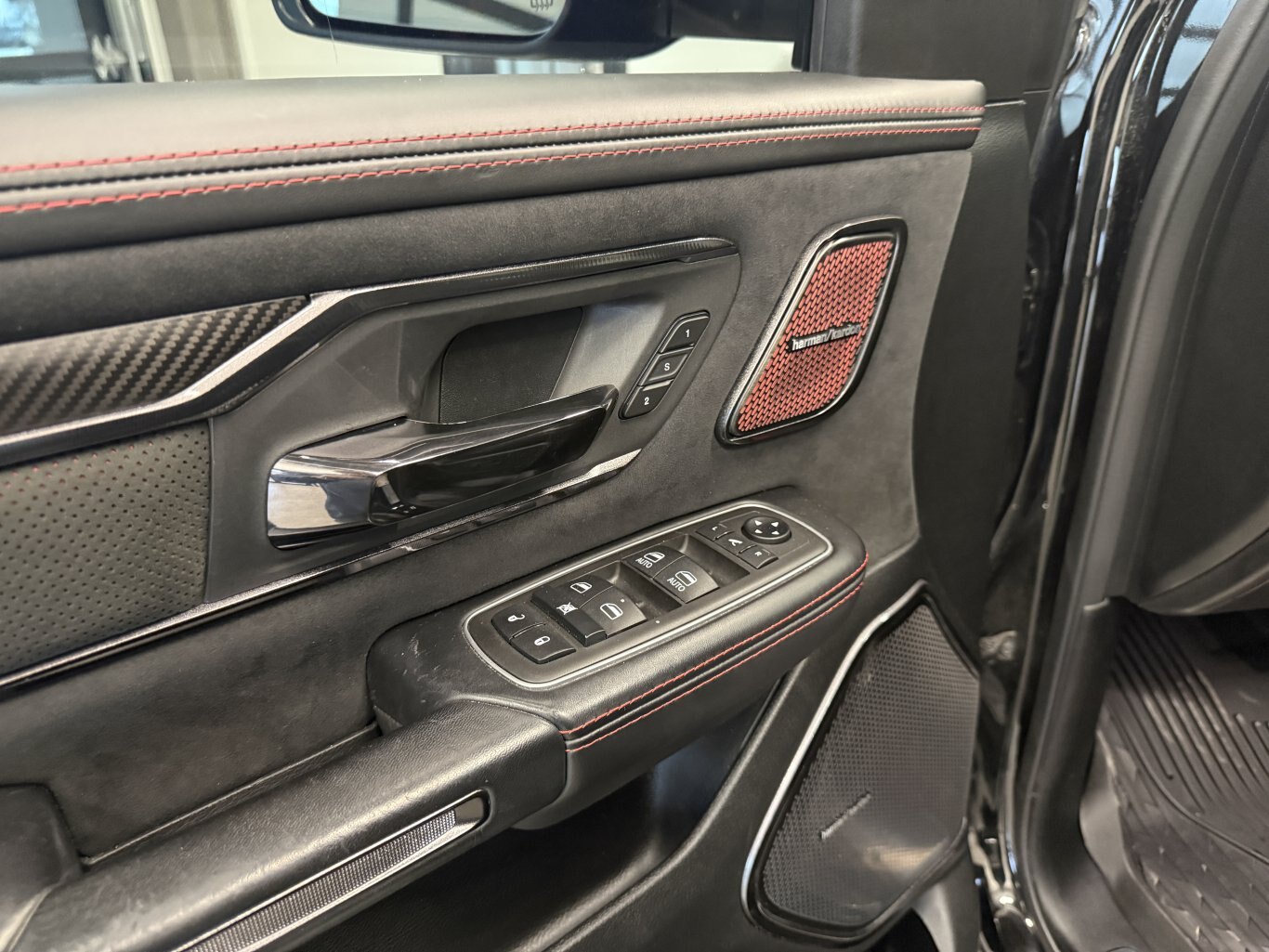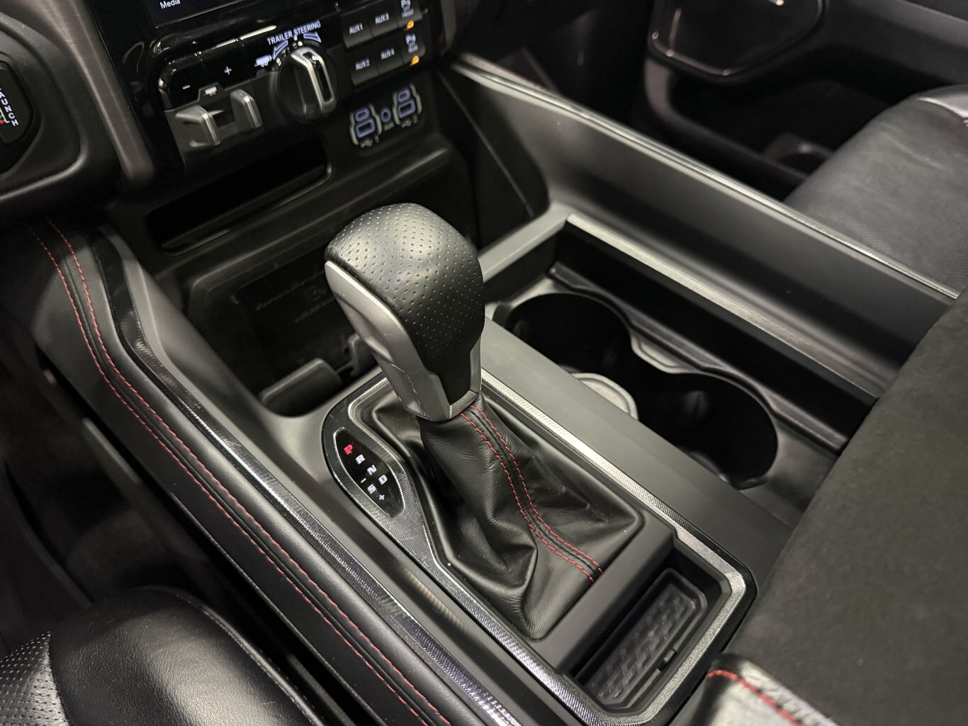Buckle up (or strap in, 'cause this beast bucks like a bronco) for this 2021 Ram 1500 TRX Crew Cab 4x4, a supercharged apocalypse on wheels detonating 702 hp and 650 lb-ft of torque from its snarling 6.2L SRT HEMI V8 supercharged engine bolted to an 8-speed TorqueFlite automatic and full-time 4WD fury. Cloaked in sinister Diamond Black Crystal Pearl exterior over a cockpit of black leather buckets, this TRX is apocalypse-ready with adaptive damping, panoramic sunroof, and a bed-mounted spare—born to blitz dunes, devour highways, or drag-race destiny!