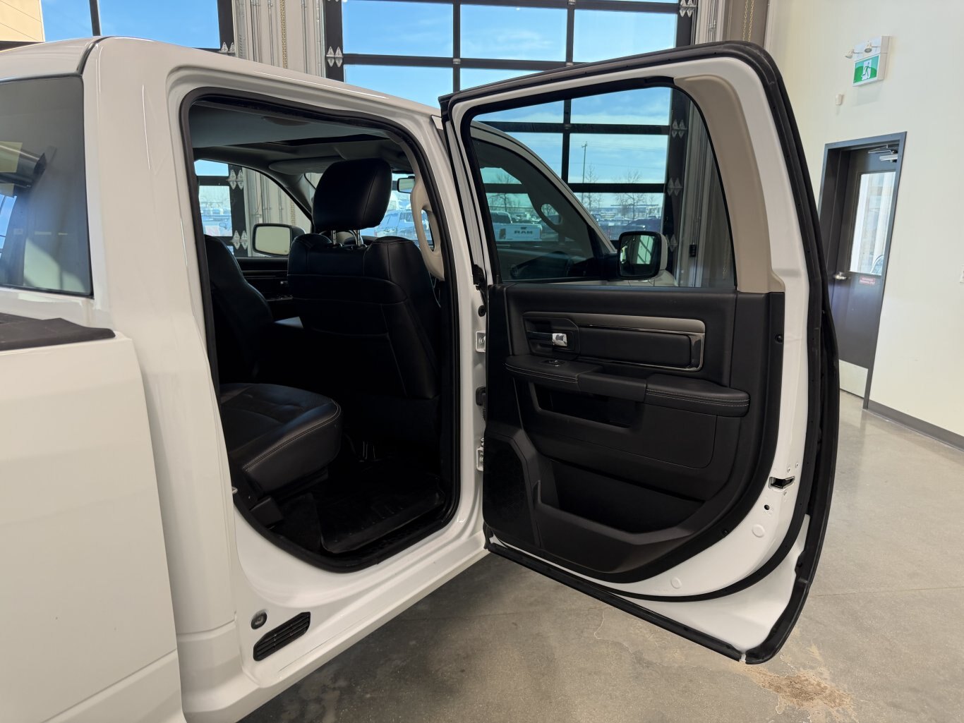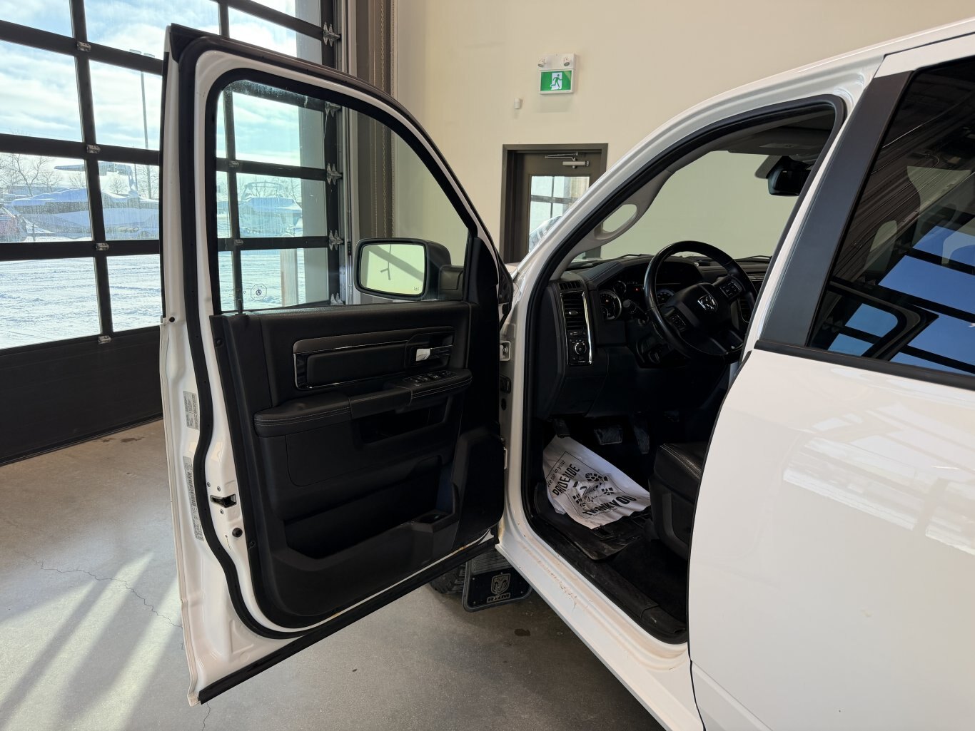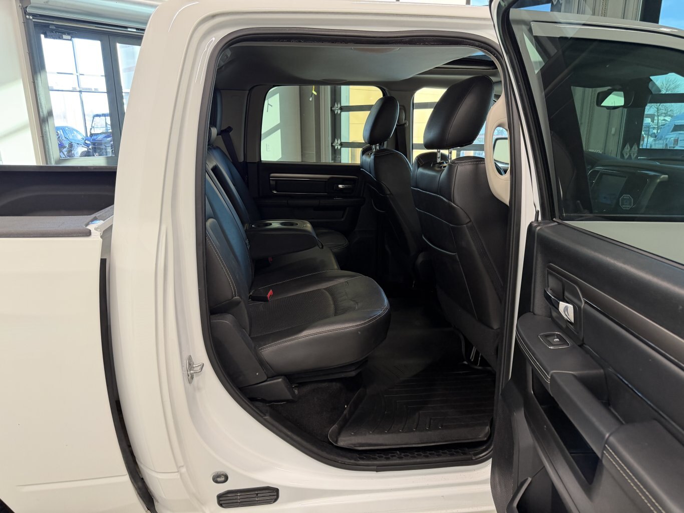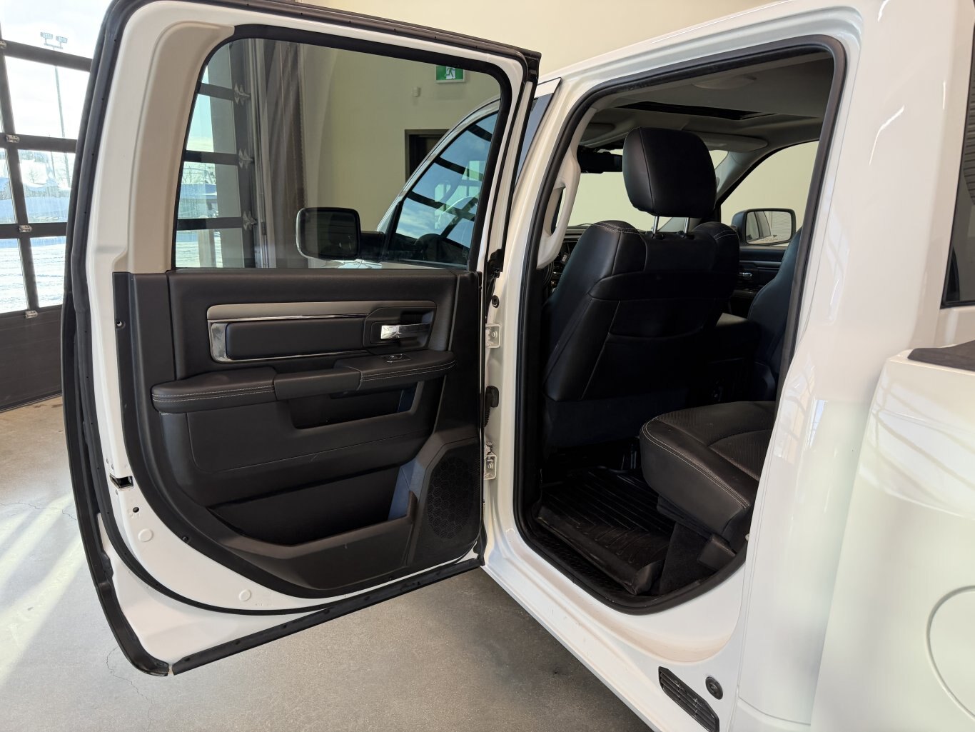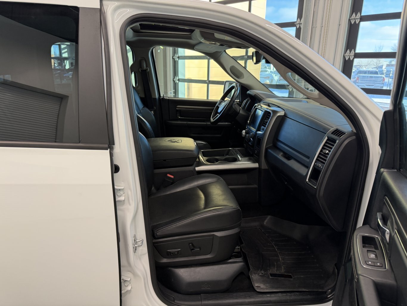 2016 RAM 1500 Sport Crew Cab 4x4 – Bright White HEMI Sport Beast, Leather Luxury Hauler! Buckle up for this 2016 RAM 1500 Sport Crew Cab 4x4, a full-size truck delivering 395 hp and 410 lb-ft of torque from its 5.7L HEMI VVT V8 with FuelSaver MDS paired to an 8-speed TorqueFlite automatic transmission and electronic shift-on-demand 4WD system. Finished in Bright White exterior over Black leather-faced high-back bucket seats with perforated inserts, this Sport is loaded with Convenience Group, Sport Premium Group, Remote Start & Security Alarm Group, power sunroof, sport performance hood, navigation, ParkView camera, trailer brake control, spray-in bedliner, anti-spin differential, and 121-litre fuel tank—built for powerful towing, premium comfort, and bold style! Vehicle Information