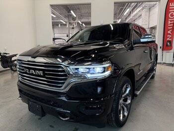 Why Buy? This RAM 1500 Rebel Crew Cab isn't just a truck—it's a HEMI off-road rebel that crushes trails with F-locker and 4WD while pampering the crew with heated leather, harman/kardon audio, and dual-pane sunroof. Granite Crystal Metallic gleams with Mopar graphics and hood decal, Mopar bed step and spray-in liner make loading easy, and trailer sway control keeps towing tight. Built for Canadian winters or summer escapes—RAM's timeless toughness wrapped in Night Edition attitude.